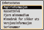 <Fjern minnemedium>Brukes til å fjerne en USB-minneenhet på en sikker måte. Dette vises kun når en USB-minneenhet er koblet til maskinen.