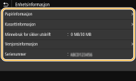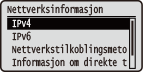 Viser nettverksinnstillingene, for eksempel maskinens IP-adresse, og status, for eksempel tilstanden til trådløs LAN-kommunikasjon.