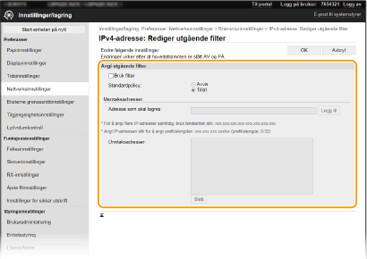 Når [Avvis] er valgt for et utgående filter Utgående flerkastings- og kringkastingspakker kan ikke filtreres. Slette en IP-adresse fra unntak Velg en IP-adresse, og klikk på [Slett]. ![]() | ||||||||||||||