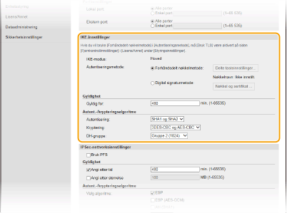 Angi innstillingene for AH/ESP, som leges til i pakker under IPSec-kommunikasjon. AH og ESP kan brukes samtidig. Du kan også velge om du vil aktivere PFS for økt sikkerhet.