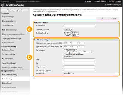 En nøkkel og sertifikat kan genereres med maskinen når det er nødvendig for kryptert kommunikasjon via Transport Layer Security (TLS). Du kan bruke TLS når du har tilgang til maskinen via Fjernkontroll. Egensignerte sertifikater brukes sammen med nøkkelen og sertifikatet som genereres i "Nettverkskommunikasjon".