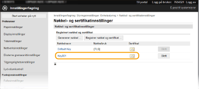 En nøkkel og sertifikat kan ikke slettes hvis det er i bruk til et formål, for eksempel når "[TLS]" eller "[IEEE 802.1X]" vises under [Nøkkelbruk]. Hvis dette er tilfelle, må du deaktivere funksjonen eller erstatte nøkkelen og sertifikatet før du sletter dem.