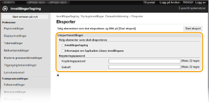 Du kan eksportere maskininnstillingsdata og lagre dem på en datamaskin. Det anbefales at du regelmessig sikkerhetskopierer viktige innstillinger.