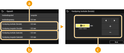Angi utskriftsposisjonen flytteretning og flyttebredde. Det er om innstillingsverdien er en "+"- eller "-"-verdi som bestemmer bindekanten som hefteranden justeres langs. Margbredden kan justeres i trinn på 0,5 mm.