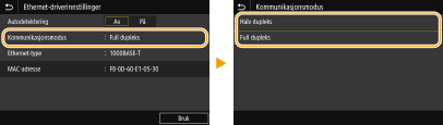 2 | <Kommunikasjonsmodus> velg kommunikasjonsmodusen.![]() <Halv dupleks> Sender og mottar kommunikasjonsdata etter tur. Velg denne når maskinen er koblet til en nettverksenhet som bruker halv dupleks. <Full dupleks> Sender og mottar kommunikasjonsdata samtidig. Bruk denne innstillingen for de fleste miljøer. |