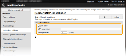 SNTP for maskinen støtter både NTP-servere (versjon 3) og SNTP-servere (versjon 3 og 4). Hvis du vil ha mer informasjon om grunnleggende handlinger som skal utføres ved oppsett av maskinen fra Fjernkontroll, kan du se Konfigurere menyalternativer fra Fjernkontroll. |