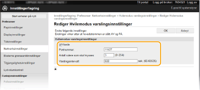 2 | Merk av for [Varsle], og angi de nødvendige innstillingene. ![]() [Varsle] Merk av i boksen for å varsle enhetsbehandlingsprogramvaren om strømstatusen for maskinen. Når [Varsle] er valgt, kan du forvente at maskinen unngår unødvendig kommunikasjon under dvalemodus og reduserer det totale strømforbruket. [Portnummer] Endre portnummeret for denne funksjonen i henhold til nettverksmiljøet. [Antall rutere som skal krysses] Angi hvor mange rutere varselspakkene kan passere gjennom. [Varslingsintervall] Angi hvor ofte maskinen skal varsle enhetsbehandlingsprogramvaren om strømstatusen. |