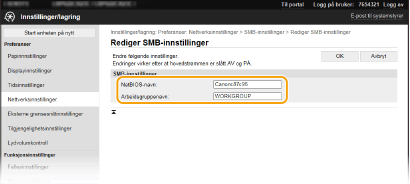Navnet på arbeidsgruppen er et navn for å gruppere flere datamaskiner slik at grunnleggende nettverksfunksjoner, for eksempel fildeling, blir tilgjengelige på et Windows-nettverk. Angi navnet på arbeidsgruppen for å identifisere gruppen der maskinen hører til.
