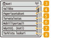 ![]() | <Valikko><Toimintoasetukset>, <Yleisasetukset> ja monet muut laitteen asetukset aloitetaan tällä painikkeella. Asetusvalikkoluettelo <Paperiasetukset>Tätä painiketta käytetään paperikasettiin ja monikäyttötasolle lisätyn paperin koon ja tyypin määrittämiseen. Paperin koon ja tyypin määrittäminen <Turvatulostus>Käytä tätä toimintoa turvatulostusasiakirjan tulostamiseen. PIN-koodilla suojattujen asiakirjojen tulostaminen (Turvatulostus) <Mobiiliportaali>Tämän avulla voit muodostaa yhteyden mobiililaitteeseen. Yhteys mobiililaitteisiin <Näyttöj. (Koti)>Tämän avulla voit muuttaa järjestyksen, jossa Koti-näytön painikkeet näytetään. Koti-näytön mukauttaminen <Tarkista laskuri>Näyttää tulosteiden kokonaismäärän. Laskurin arvon näyttäminen |
