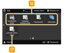 ![]() | Application Library (Sovelluskirjasto) ‑painikeNäiden painikkeiden avulla voit suorittaa kätevästi toiminnon yhdellä kosketuksella. Katso lisätietoja Application Library (Sovelluskirjasto) -oppaasta online-opassivustolta. <uniFLOW Online Setup>Voit tarkistaa laitteen käyttötilan ja käyttäjän linkittämällä pilvipalveluun. Lisätietoja on Canonin sivustolla. |