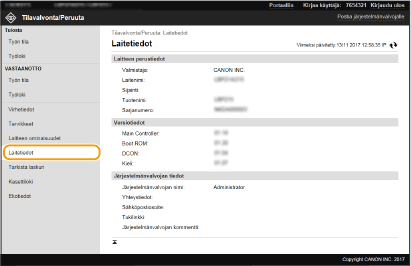 Tiedot laitteesta ja järjestelmänvalvojasta näytetään. Laitenimi ja muut tässä näytettävät järjestelmänvalvojan tiedot vastaavat asetuksia kohdassa [Järjestelmänvalvojan tiedot] sivulla [Käyttäjähallinta] tai kohdassa [Laitetietojen asetukset] sivulla [Laitteen hallinta].