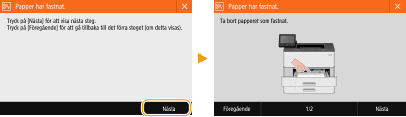 I vissa fall visas anvisningar om hur du ska åtgärda felet. Följ anvisningarna på skärmen för att lösa problemet. Skärmen som visas när ett pappersstopp inträffar visas nedan som ett exempel.