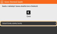 Pokud se zpráva zobrazí, když zařízení přijímá I-Fax, přístroj nebude tisknout, aby nebyl tisk vypbledlý. Místo toho se přijatá data uloží do paměti. Pokud chcete pokračovat v tisku, přestože dochází toner, nastavte funkci <Pokr. v tisku. s polopr. kaz.>/<Pokrač. v tisku při nízkém stavu kazety> na <Zapnuto>. <Pokr. v tisku. s polopr. kaz.>/<Pokrač. v tisku při nízkém stavu kazety>