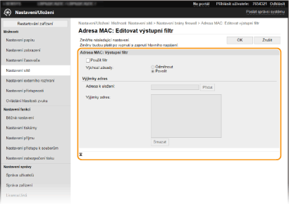 Zadáte-li adresy MAC nesprávně, nebude možné se k zařízení připojit prostřednictvím Vzdáleného uživatelského rozhraní. V takovém případě je třeba nastavit <Filtr adres MAC> na <Vyp>. <Filtr adres MAC>