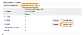 Chcete-li nastavit počet opět na nulu, klikněte na příslušný textový odkaz pod [ID oddělení] a klikněte na [Vynulovat počty]  [OK]. Chcete-li nastavit počet na nulu pro všechna ID oddělení, klikněte na [Vymazat všechny počty]  [OK].
