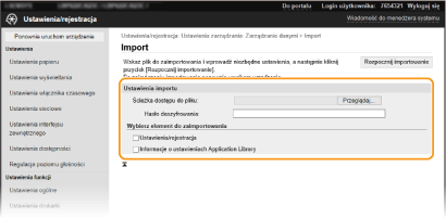 Dane ustawień urządzenia można zapisać w komputerze (eksportować). Dane zapisane na komputerze można zarejestrować w urządzeniu (importować). Dane wyeksportowane z tego urządzenia można zaimportować do innego urządzenia o takim samym modelu. Dzięki temu możliwe jest łatwe skopiowanie rozmaitych danych ustawień do wielu urządzeń. Aby korzystać z tych funkcji, wymagane jest zalogowanie się do trybu menedżera systemu.