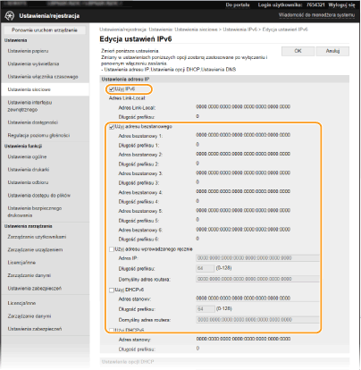 Adresy IPv6 urządzenia można skonfigurować za pomocą Zdalnego interfejsu użytkownika. Przed rozpoczęciem konfiguracji adresów IPv6 należy sprawdzić ustawienia adresu IPv4 (Wyświetlanie ustawień IPv4). Aby korzystać z adresów IPv6, należy poprawnie skonfigurować ustawienia adresu IPv4. Urządzenie może korzystać z następujących wielu adresów IPv6: