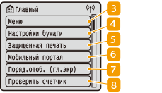 ![]() | <Меню>Данная клавиша позволяет задавать <Настройки функций>, <Настройки> и многие другие настройки аппарата. Список меню настройки <Настройки бумаги>Эта кнопка используется для указания формата и типа бумаги, загруженной в лоток для бумаги и в универсальный лоток. Указание формата и типа бумаги <Защищенная печать>Эта функция позволяет напечатать защищенный документ. Печать документа, защищенного PIN-кодом (защищенная печать) <Мобильный портал>Служит для установления подключения к мобильному устройству. Подключение мобильных устройств <Поряд.отоб. (гл.экр)>Служит для изменения порядка расположения кнопок на экране Главный. Настройка экрана Главный <Проверить счетчик>Показывает общее число распечаток. Просмотр значения счетчика |