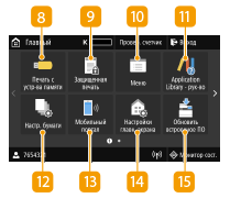 ![]() | <Печать с устр-ва памяти>Печать файлов, сохраненных на устройстве памяти USB. Печать с устройства памяти USB (печать с внешнего запоминающего устройства) <Защищенная печать>Эта функция позволяет напечатать защищенный документ. Печать документа, защищенного PIN-кодом (защищенная печать) <Меню>Данная клавиша позволяет задавать <Настройки функций>, <Настройки> и многие другие настройки аппарата. Список меню настройки <Application Library - рук-во>Отображение описания Application Library (Библиотека приложений). <Настр. бумаги>Эта кнопка используется для указания формата и типа бумаги, загруженной в лоток для бумаги и в универсальный лоток. Указание формата и типа бумаги <Мобильный портал>Служит для установления подключения к мобильному устройству. Подключение мобильных устройств <Настройки главн. экрана>Служит для изменения порядка расположения кнопок на экране Главный. Настройка экрана Главный <Обновить встроенное ПО>Всегда обновляйте встроенное программное обеспечение через Интернет. Обновление встроенного программного обеспечения |