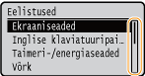 Saate muuta mitmesuguseid ekraaniga seotud sätteid (nt kuvamiskeel): <Ekraaniseaded> Saate muuta kuva, mis kuvatakse automaatselt, kui seade on määratud aja jooksul jõude olnud: <Funktsioon pärast automaatset lähtestust> Saate muuta mitmesuguseid töösätteid (nt ekraani heldustase): <Hõlbustus> |