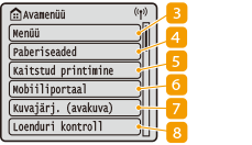 ![]() | <Menüü><Funktsiooniseaded>, <Eelistused> ja paljud muud seadme sätted käivituvad sellest nupust. Seadistusmenüü loend <Paberiseaded>Seda nuppu kasutatakse paberisahtlisse ja universaalalusele asetatud paberi suuruse ning tüübi määramiseks. Paberiformaadi ja -liigi määramine <Kaitstud printimine>Seda funktsiooni kasutatakse kaitstud dokumendi printimiseks. PIN-koodiga kaitstud dokumendi printimine (Kaitstud printimine) <Mobiiliportaal>Kasutage seda ühenduse loomiseks mobiilseadmega. Mobiilseadmega ühendamine <Kuvajärj. (avakuva)>Võimaldab muuta kuval Avamenüü kuvatavate nuppude järjekorda. Kuva Avamenüü kohandamine <Loenduri kontroll>Näitab väljaprintide koguarvu. Loenduri näidu vaatamine |