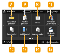 ![]() | <Mälukandjalt printimine>Prindib USB-mäluseadmesse salvestatud failid. USB-mäluseadmelt printimine (Mäluseadmelt printimine) <Kaitstud printimine>Seda funktsiooni kasutatakse kaitstud dokumendi printimiseks. PIN-koodiga kaitstud dokumendi printimine (Kaitstud printimine) <Menüü><Funktsiooniseaded>, <Eelistused> ja paljud muud seadme sätted käivituvad sellest nupust. Seadistusmenüü loend <Application Library juhend>Kuvab funktsiooni Application Library (Rakenduste teek) kirjelduse. <Paberiseaded>Seda nuppu kasutatakse paberisahtlisse ja universaalalusele asetatud paberi suuruse ning tüübi määramiseks. Paberiformaadi ja -liigi määramine <Mobiiliportaal>Kasutage seda ühenduse loomiseks mobiilseadmega. Mobiilseadmega ühendamine <Avakuva seaded>Võimaldab muuta kuval Avamenüü kuvatavate nuppude järjekorda. Kuva Avamenüü kohandamine <Uuenda püsivara>Võimaldab uuendada püsivara interneti kaudu. Püsivara uuendamine |