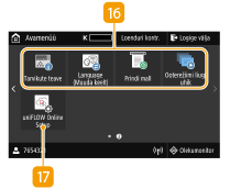 ![]() | Application Library (Rakenduste teek) nuppNende nuppude abil saate käsitseda funktsioone mugavalt ühe puudutusega. Lisateavet vaadake Application Library (Rakenduste teek) kasutusjuhendist veebijuhendi saidil. <uniFLOW Online Setup>Seadme olekut ja kasutajat saate vaadata pilveteenusega linkimise teel. Lisateavet leiate Canoni veebisaidilt. |