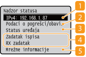 ), prikazuje se zaslon u kojemu možete provjeriti napredak dokumenata te status uređaja i informacije o mrežnim postavkama.
