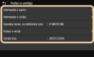 Prikazuje serijski broj uređaja.