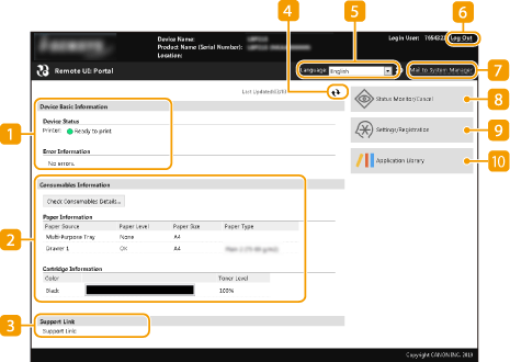 Kada se prijavite na Remote UI (Korisničko sučelje za daljinski pristup), pojavit će se sljedeća stranica portala. U ovom se odjeljku opisuju stavke koje su prikazane na stranici portala te osnovni postupci.