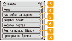![]() | <Меню><Настройки на функция>, <Предпочитания> и много други настройки на устройството се стартират от този бутон. Списък на меню с настройки <Настройки за хартия>Този бутон се използва за указване на формата и типа на хартията, заредена в касетата за хартия и многофункционалната тава. Задаване на формат и тип на хартията <Защитен печат>Използвайте тази функция за отпечатване на защитен документ. Отпечатване на документ, защитен с PIN код (Защитен печат) <Мобилен портал>Използвайте този бутон за установяване на връзка с мобилно устройство. Свързване с мобилни устройства <Ред на показ. (Нач.)>Позволява ви да промените реда, в който се показват бутоните на екрана Начало. Персонализиране на екрана Начало <Проверка на брояча>Показва общия обем на отпечатванията. Преглед на показанията на брояча |