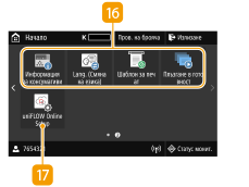 ![]() | Бутон Application Library (Библиотека с приложения)Можете да използвате тези бутони за удобно извършване на функция чрез операция с едно докосване. За повече информация вижте ръководството за Application Library (Библиотека с приложения) в уеб сайта с онлайн ръководства. <uniFLOW Online Setup>Можете да проверите състоянието на употреба на устройството и потребителя, като се свържете с услуга в облака. За повече информация вижте уеб сайта на Canon. |