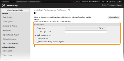 Makine ayarları verileri bilgisayarınıza kaydedilebilir (dışarı aktarılabilir). Bilgisayarınıza kaydedilen veriler, makineye de kaydedilebilir (içeri aktarılabilir). Bu makineden dışarı aktarılan veriler, aynı model diğer bir makine tarafından içeri aktarılabilir. Böylelikle, çeşitli ayarları birden fazla sayıda makineye kolayca kopyalayabilirsiniz. Bu özellikleri kullanmak için Sistem Yöneticisi Modunda oturum açmanız gerekir.