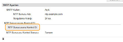 NTP/SNTP sunucusu ile iletişimi test etme[SNTP Ayarları] bölümünde [Ayarlar/Kayıt]