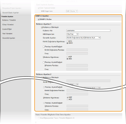 Basit Ağ Yönetimi Protokolü (SNMP), Yönetim Bilgi Tabanı (MIB) kullanılarak bir ağdaki iletişim aygıtlarını izleme ve kontrol etme protokolüdür. Makine, SNMPv1'i ve güvenliği geliştirilmiş SNMPv3'ü destekler. Belgeleri yazdırırken veya Uzak Kullanıcı Arabirimini kullanırken bir bilgisayardan makinenin durumunu kontrol edebilirsiniz. SNMPv1 veya SNMPv3'ü ayrı ayrı veya her ikisini de aynı anda etkinleştirebilirsiniz. Her bir sürümün ayarlarını, ağ ortamınıza ve kullanım amacınıza uyacak şekilde belirtin.