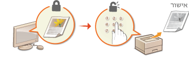 אם תקבע PIN בעת הדפסה של מסמך ממחשב, המסמך ישמר בזיכרון המכשיר ולא יודפס עד להזנת ה-PIN הנכון בלוח ההפעלה של המכשיר. הפונקציה נקראת "הדפסה מאובטחת", והמסמך המוגן באמצעות PIN נקרא "מסמך מאובטח". שימוש בהדפסה מאובטחת מונע השארת תדפיסים של מסמכים סודיים ללא השגחה.