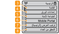 <إعدادات الوظائف>، <التفضيلات>، ويمكن بدء العديد من إعدادات الجهاز الأخرى من هذا الزر. إعداد قائمة القوائم