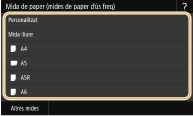 Si la pantalla que es mostra més amunt no apareix quan carregueu paper.Si sempre carregueu el mateix paper a la safata multiús, podeu ometre les operacions d'ajust del paper desant la mida i el tipus de paper com a opció predeterminada. No obstant això, quan es desa l'opció predeterminada, la pantalla que es mostra més amunt no apareix. Per visualitzar la pantalla, seleccioneu <Especificar en carregar paper> (Desament de les opcions de paper predeterminades per a la safata multiús).