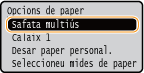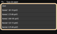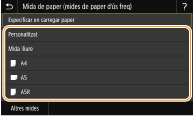 Després de desar l'opció de paper predeterminada, la pantalla d'opcions del paper no apareix quan es carrega el paper i sempre s'utilitza la mateixa opció. Si carregueu paper d'una altra mida o tipus sense canviar les opcions del paper, pot ser que l'equip no imprimeixi correctament. Per evitar aquest problema, seleccioneu <Especificar en carregar paper> al pas 3 i, a continuació, carregueu el paper.
