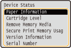 <Remove Memory Media>Використовується для безпечного виймання пристрою USB-пам’яті. Відображається, тільки якщо до апарата підключено пристрій USB-пам’яті.
