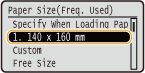 Формати паперу, зареєстровані під час виконання описаної вище процедури, відображаються на екрані вибору формату паперу для шухляди або багатоцільового лотка.