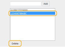 2 | Укажіть адреси-винятки. У текстовому полі [Address to Register] введіть MAC-адресу й натисніть кнопку [Add]. Використовувати в адресі дефіс або двокрапку як роздільник не потрібно. ![]() Перевірка помилок введення Якщо MAC-адреси введено неправильно, доступ до апарата через Remote UI може стати неможливим. У такому разі для параметра <MAC Address Filter> потрібно встановити значення <Off>. <MAC Address Filter> ![]() Якщо вибрано елемент [Reject] для вихідного фільтра Вихідні пакети багатопотокового й широкомовного передавання неможливо відфільтрувати. Видалення MAC-адреси зі списку винятків Виділіть MAC-адресу та натисніть кнопку [Delete]. ![]() | ||||