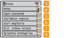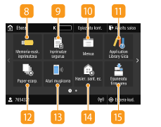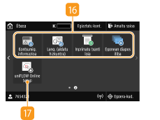 Sakatu inprimatze-egoera ikusteko, erabilera-historia begiratzeko edo makinaren IP helbidea bezalako sare-ezarpenak begiratzeko. Makinaren egoera ere egiazta dezakezu; adibidez, gelditzen den papera edo gelditzen diren toner-kartutxoak, edo errorerik gertatu baden. <Egoera-kud.> pantaila