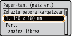 Goiko prozedurari jarraituz erregistratutako paper-tamainak paper-tiraderarentzako edo erabilera anitzeko erretiluarentzako paper-tamainaren hautaketaren pantailan agertzen dira.
