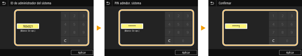 Para cancelar las opciones de ID y PIN del administrador del sistema, borre la información introducida en  y seleccione <Aplicar> con los campos en blanco.