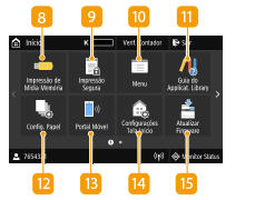![]() | <Impressão de Mídia Memória>Imprime arquivos armazenados em um dispositivo de memória USB. Imprimindo a partir de um dispositivo de memória USB (Impressão de Mídia de Memória) <Impressão Segura>Use esta função para imprimir um documento seguro. Imprimindo um Documento Protegido por PIN (Impressão Segura) <Menu><Configurações de Função>, <Preferências> e muitas outras configurações de máquina são iniciadas a partir deste botão. Definindo a lista de menu <Guia do Applicat. Library>Exibe uma descrição de uma Application Library (Biblioteca de Aplicativos). <Config. Papel>Este botão é usado para especificar o tamanho e tipo de papel carregado na gaveta de papel e na bandeja multiuso. Especificando o tipo e o tamanho do papel <Portal Móvel>Use para estabelecer uma conexão a um dispositivo móvel. Conexão a dispositivos móveis <Configurações Tela Início>Permite alterar a ordem em que os botões da Tela Início são exibidos. Personalizando a tela Início <Atualizar Firmware>Permite atualizar o firmware via Internet. Atualização de Firmware |