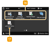 ![]() | Botão da Application Library (Biblioteca de Aplicativos)Você pode usar estes botões para executar funções de forma conveniente por meio de uma operação de um toque. Para obter mais informações, consulte o manual da Application Library (Biblioteca de Aplicativos) no site do manual on-line. <uniFLOW Online Setup>Você pode verificar o status de uso do dispositivo e o usuário por meio da vinculação ao serviço de nuvem. Para mais informações, consulte o site da Canon. |