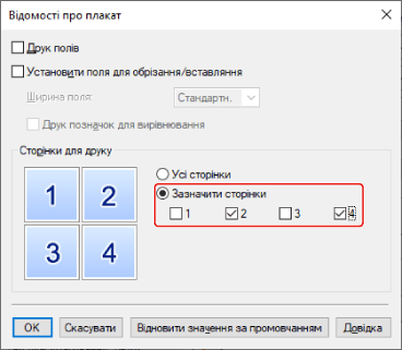 Діалогове вікно [Відомості про плакат] > [Сторінки для друку] > [Зазначити сторінки]: [2] та [4]