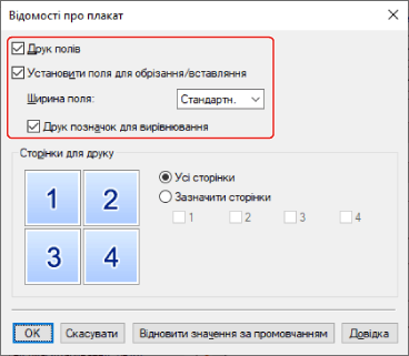Діалогове вікно [Відомості про плакат]: [Друк полів], [Установити поля для обрізання/вставляння] та [Друк позначок для вирівнювання]