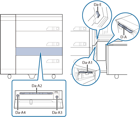 En la ilustración siguiente se indica la ubicación del atasco de papel. Consúltela para quitar el papel atascado. Da-A2, Da-A3 y Da-A4 indican las posiciones del Paper Deck Path Kit-A, los cuales son productos opcionales del Depósito de Papel Multibandeja D. |